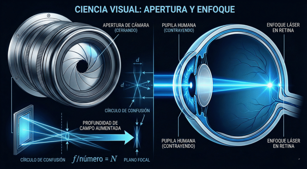 Imagina una cámara fotográfica. Cuando cierras la apertura del diafragma (el agujero por donde entra la luz), aumenta la «profundidad de campo». Esto significa que tanto los objetos cercanos como los lejanos se ven nítidos al mismo tiempo.