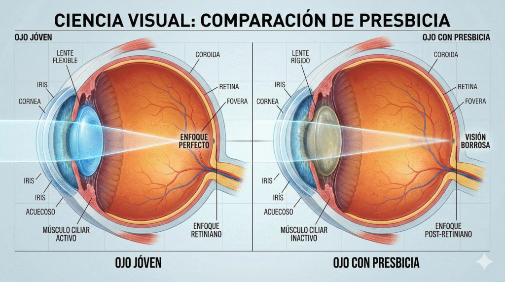 No es una enfermedad; es un proceso natural de envejecimiento. El cristalino de tu ojo, que en la juventud es flexible como una gomita, se endurece con el tiempo. Esto impide que los músculos del ojo cambien su forma para enfocar objetos cercanos. Es la razón por la que ves a tus padres o abuelos estirando el brazo para leer el periódico.