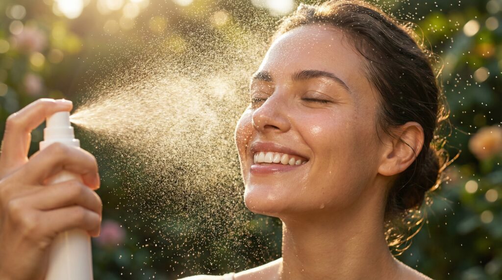 La receta no termina en la botella; termina en la nevera. La temperatura es el ingrediente secreto. Al aplicar la bruma fría (aprox. 4°C) sobre la piel tibia, provocas una vasoconstricción inicial seguida de una vasodilatación refleja. Este «gimnasio vascular», sumado a la química de las especias, desinflama las bolsas de los ojos y reduce la hinchazón matutina (puffy face) en segundos. No es solo un tónico; es crioterapia bioactiva.