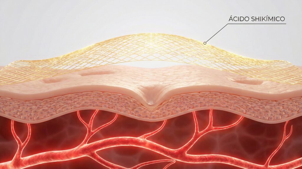 ¿Por qué el anís estrellado? No es por su olor. Esta estrella de madera contiene una joya oculta llamada Ácido Shikímico. En la industria farmacéutica, este compuesto es tan valioso que se usa como base para antivirales potentes, pero en tu piel actúa como un arquitecto. Ofrece una exfoliación química extremadamente suave (sin la irritación de los ácidos sintéticos) y, lo más importante, tiene una propiedad física única: al secarse, crea una micro-película invisible sobre la epidermis.