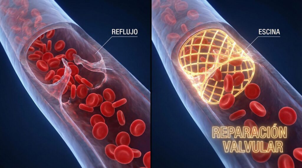 El secreto no es magia, es una molécula llamada Escina. Este compuesto activo actúa como un ingeniero civil para tus venas. Primero, inhibe las enzimas destructoras (como la hialuronidasa) que se comen las paredes de tus capilares, haciéndolas débiles y permeables. Al bloquearlas, la Escina «sella» las fugas, impidiendo que el líquido se escape hacia los tejidos y cause hinchazón.