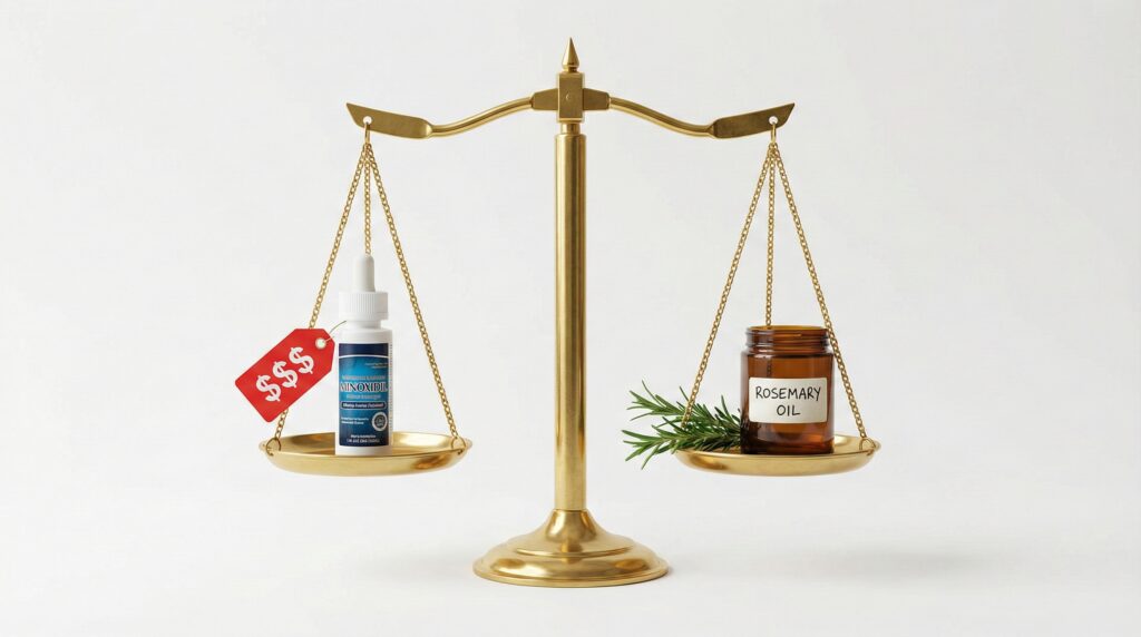 Hablemos de tu bolsillo. El tratamiento con Minoxidil es un matrimonio de por vida; si lo dejas, el cabello nuevo se cae. Esto te costará unos $600 dólares al año, o $3,000 cada 5 años. El aceite de romero casero te cuesta unos $5 dólares en ingredientes y te dura meses. En 5 años, el ahorro es de casi $2,800 dólares. Con ese dinero podrías pagarte unas vacaciones de lujo, luciendo tu melena recuperada naturalmente.