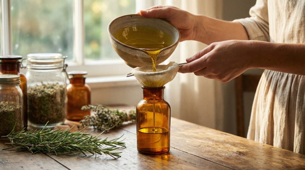 Filtrado: Cuela el aceite, descarta las hojas y guárdalo en un frasco de vidrio oscuro (ámbar) para protegerlo de la luz.