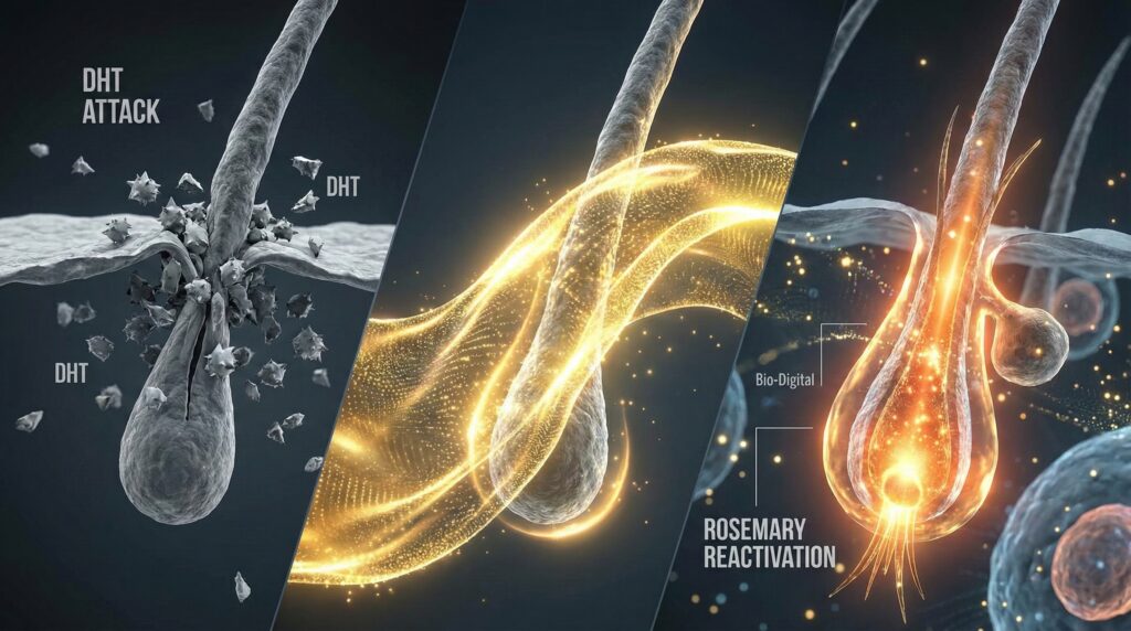 Para entender por qué el romero funciona, primero debemos entender por qué te quedas calvo. En la mayoría de los casos de alopecia (androgenética), el culpable no es el estrés ni la mala suerte, es una hormona llamada Dihidrotestosterona (DHT). Esta hormona se une a tus folículos pilosos y los «asfixia» lentamente, haciéndolos cada vez más finos hasta que desaparecen.